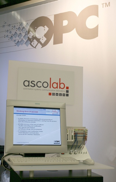 The ascolab GmbH presents services arround OPC on the Hannover Fair. On the shared booth of the OPC Foundation (Hall 11, B 13) representing companies Cyberlogic, DVT Machine Vision, Fast Automation, Iconics, Siemens and Wonderware show their products together with ascolab. As in the former years the OPC booth became a highly frequented meeting point for OPC users, automation vendors and system integrators, discussing technical details in relaxed atmosphere. The special intrests are focused on the architecture of the new OPC UA interface (Unified Architecture).